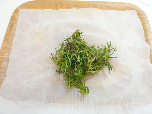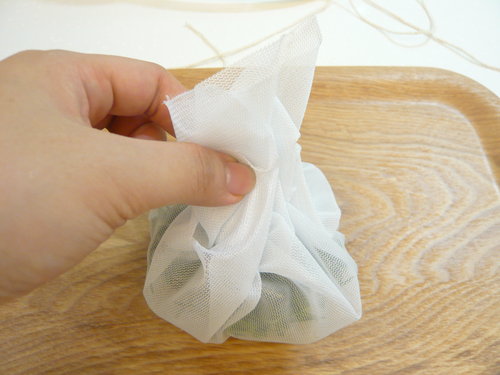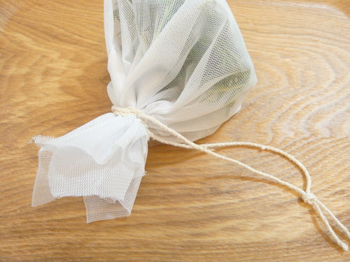 棉繩1小段、迷迭香(各式香草都可以)、棉布或透氣的布都可以(剛好家中有破掉的洗衣袋所以拿來使用)