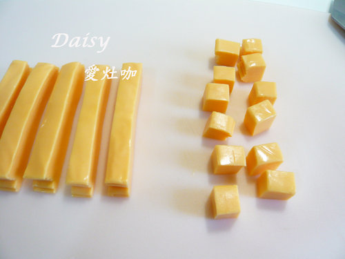 3. 4片起司堆疊成厚片並切小塊狀