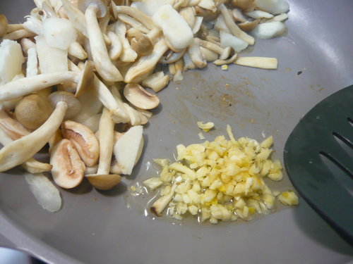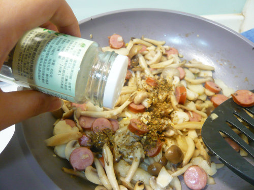 2. 洋菇切厚片、杏鮑菇撕條狀、香腸切片、蒜頭切末