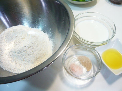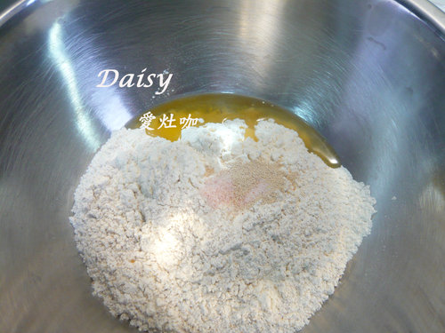 高筋麵粉160g、全麥麵粉40g、速發酵母粉1/4匙、鹽1/2匙、油10g、鮮奶120cc