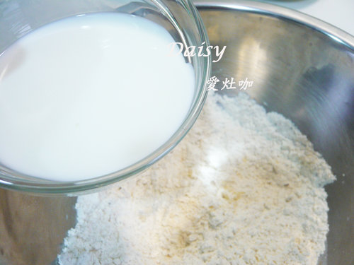 2. 再將剩餘的牛奶慢慢加入材料中攪伴均勻成無粉狀不黏手麵團