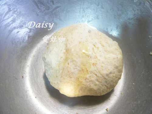 4. 將麵團折成圓形狀放入工作盆中,表面抹上少許油並用保鮮模蓋上。放入微波爐或烤箱中發酵1小時(冬天可在烤箱中放入一杯熱水提高溫度)