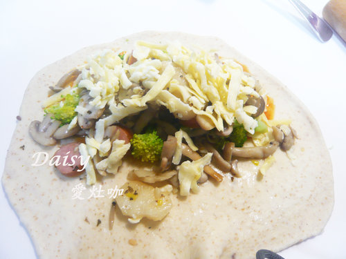 8. 將麵團擀成圓形薄片狀,鋪上起司、綠花菜與炒好的餡料