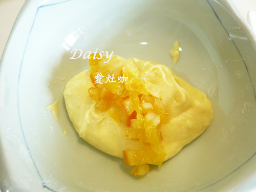 5. 紅石榴、糖漬柳橙分別加入麵糊中攪拌