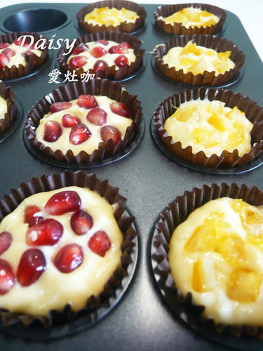 6. 用湯匙將麵糊放入紙杯中,並在麵糊上方鋪上紅石榴與糖漬柳橙。放入已預熱190度的烤箱中烘烤20分