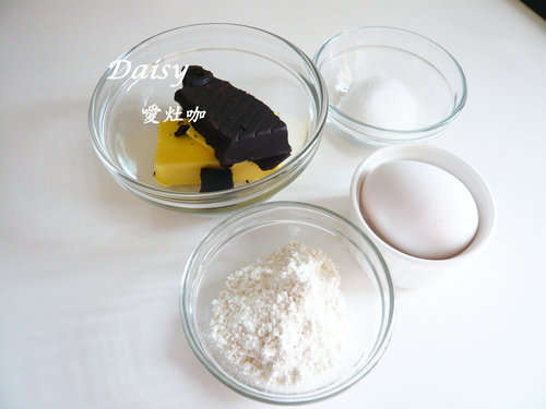 雞蛋1顆、無鹽奶油33g、黑巧克力塊50g、低筋麵粉20g、細砂糖15g