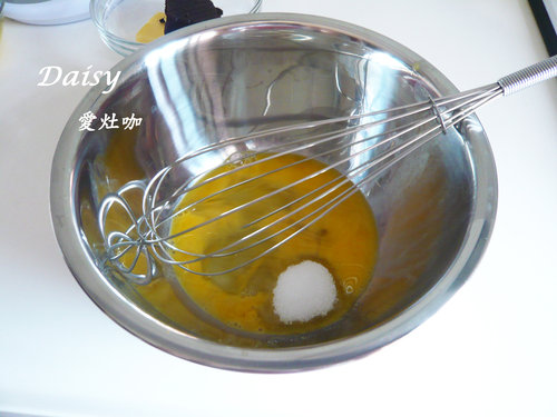 2. 雞蛋與細砂糖用打蛋器攪拌均勻