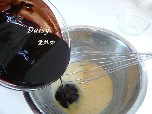 4. 溶化完成的奶油巧克力加入麵糊攪伴均勻