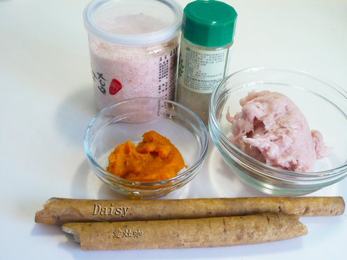 南瓜泥50g、市售魚漿100g、牛蒡半支、白胡椒少許、鹽少許