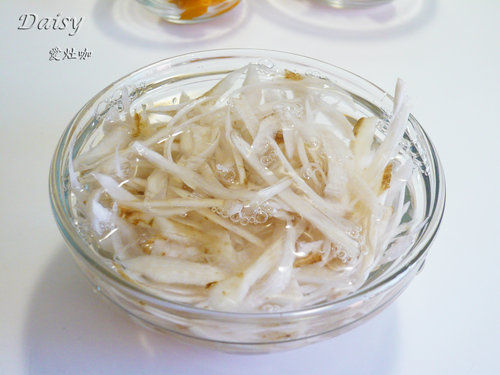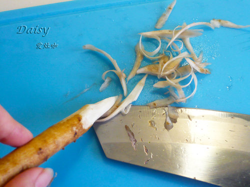 1. 牛蒡洗乾淨後像削鉛筆般削成薄片狀泡水避免氧化變色