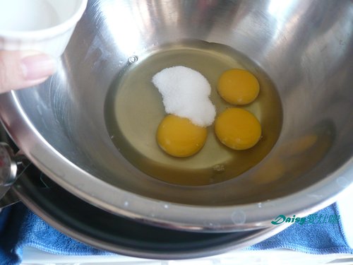 1. 雞蛋加入細砂糖放在以加熱至50度的熱水中隔水加溫,並用電動打蛋器高速攪打
