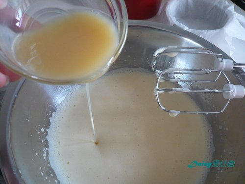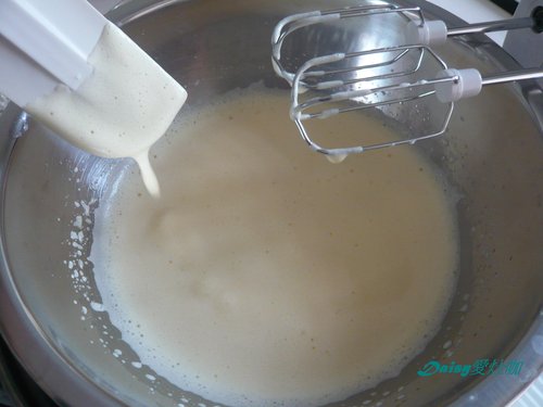 4. 一邊倒牛奶蜂蜜水一邊用高速攪打蛋液至打發