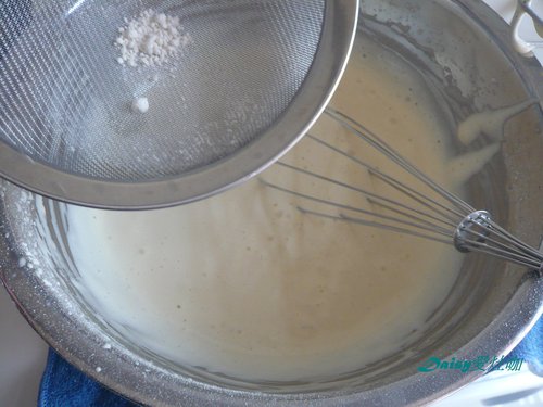 6. 將低筋麵粉分2次篩入蛋糊,用攪拌器攪拌均勻