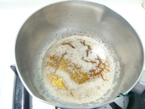 1、奶油放入鍋中以小火煮至溶化,煮的過程中會起較大的泡泡