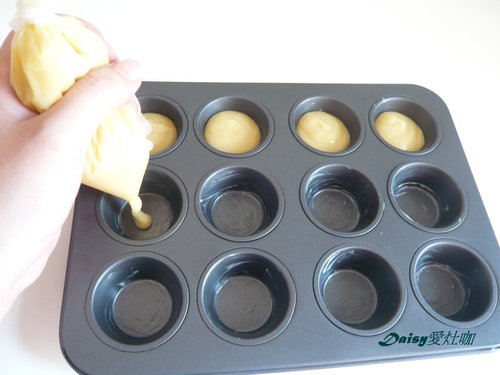 8 、 先將烤盤抹上奶油方便脫模, 將麵糊分擠到12個小模拷盤中(擠1/2高度)