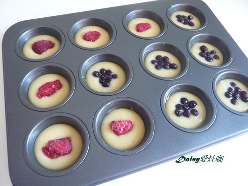 9 、 每個麵糊中間壓入覆盆子、藍莓。180度烤20分鐘至上色